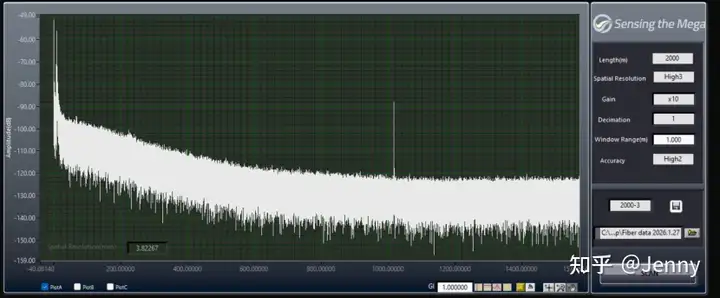 近期,昊衡科技OFDR设备也对某1公里左右的空芯光纤进行了实际测试,从结果曲线中可以看出,随着距离增加,其传输损耗逐渐变大;因客户的空芯光纤类型为PBGF,主要用于传感,其OFDR扫描曲线符合理论要求。